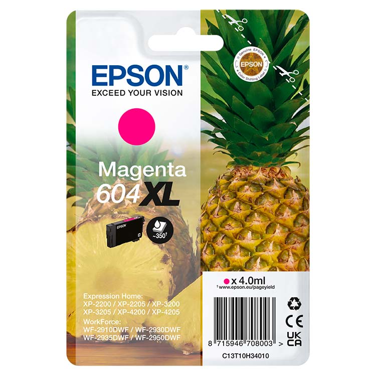 Cartucho de tinta original Epson 604XL piña de color magenta, rendimiento 350 páginas.